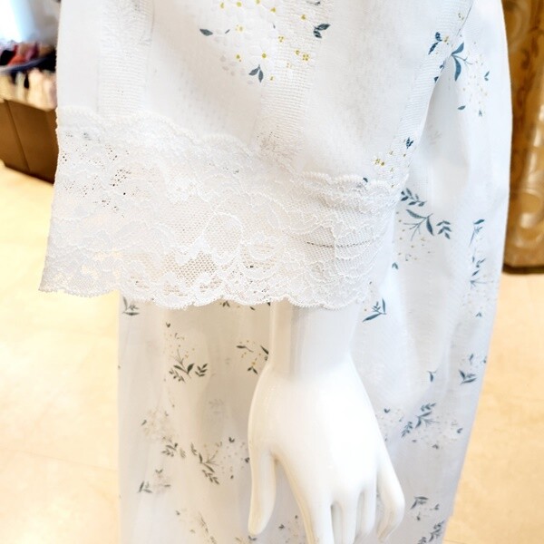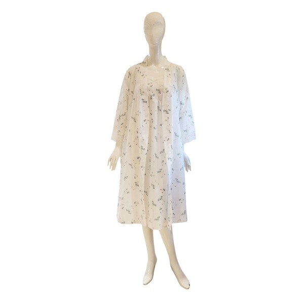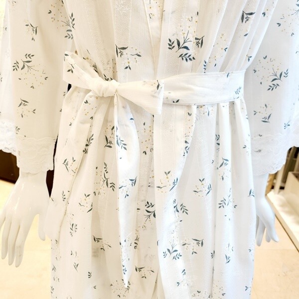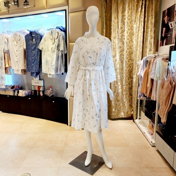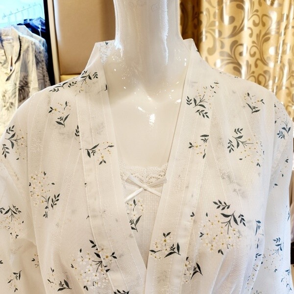 깨끗한 아이보리 컬러감의 조직감 있는면 도비 소재를 사용한 꽃나염 로브가운입니다.