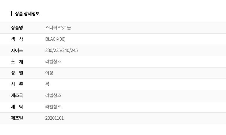 1. 제품 소재 (운동화인 경우에는 겉감, 안감을 구분하여 표시) 라벨참조