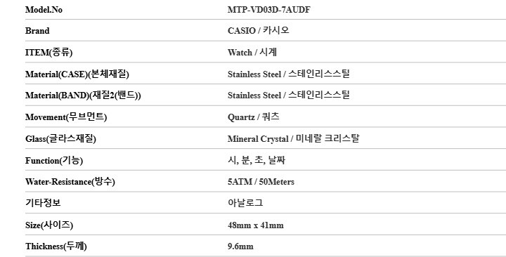 7. 주요 사양 | 스테인리스스틸 시계 쿼츠 |