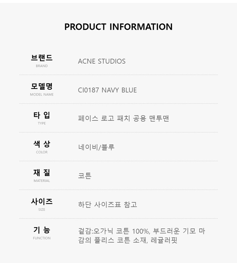 아크네스튜디오 CI0187 NAVY BLUE (885) 페이스 로고 패치 공용 맨투맨