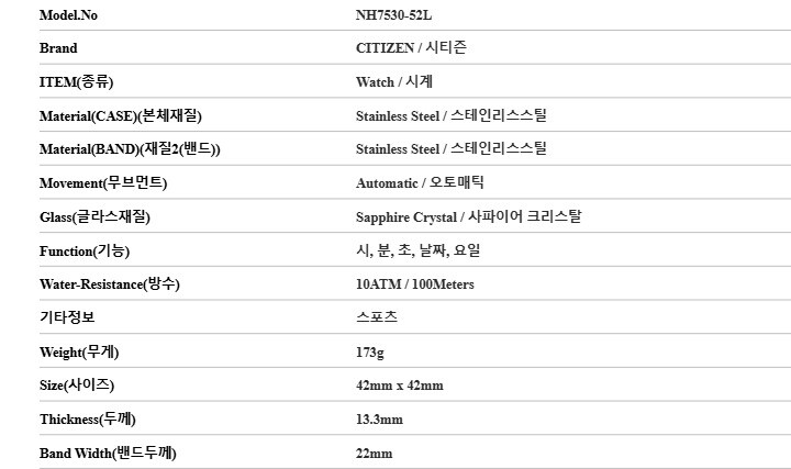 | 7. 주요 사양 | 스테인리스스틸 시계 오토매틱 |