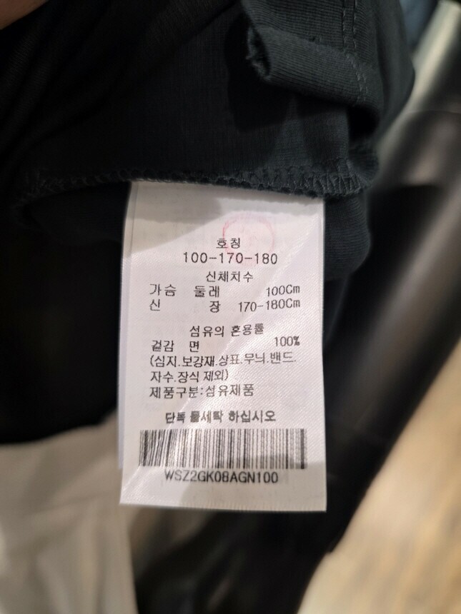 | 1. 제품 소재 (섬유의 조성 또는 혼용률을 백분율로 표시, 기능성인 경우 성적서 또는 허가서) | 겉감 :면 100% (심지,보강재,상표,무늬,밴드,자수,장식 제외) |