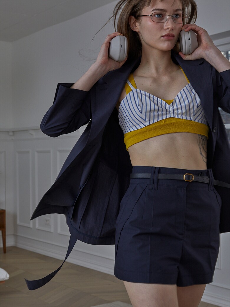 - 곡선으로 디자인된 허리 여밈이 포인트되는 하이웨이스트 숏팬츠입니다.