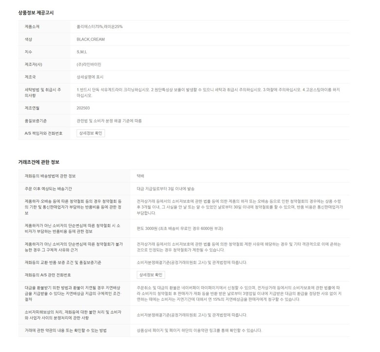 | 6. 세탁방법 및 취급시 주의사항 | 상품상세참조 |