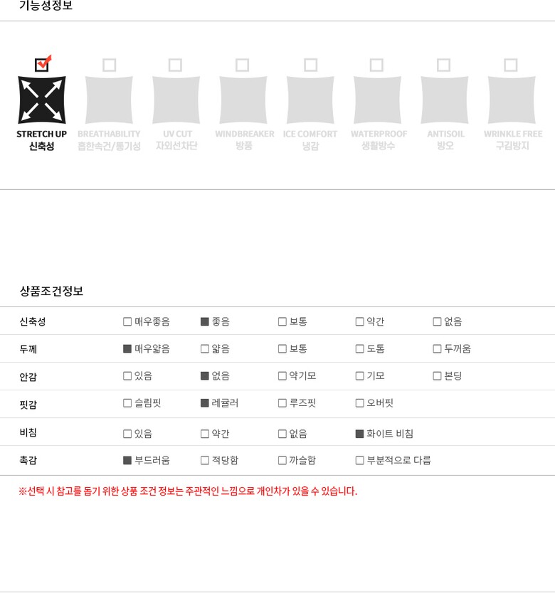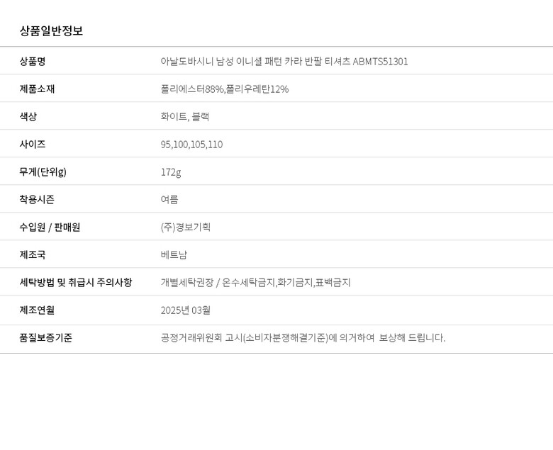 | 6. 세탁방법 및 취급시 주의사항 | 개별세탁권장/온수세탁금지,화기금지,표백금지 |