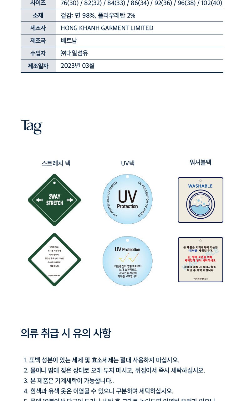 1. 제품 소재 (섬유의 조성 또는 혼용률을 백분율로 표시, 기능성인 경우 성적서 또는 허가서) | 겉감 : 면 98%, 폴리우레탄 2% |