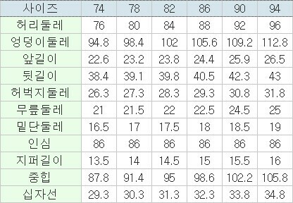 | 3. 치수 | 74(28~29),78(30~31),82(32~33),86(34~35),90(36),94(37) |