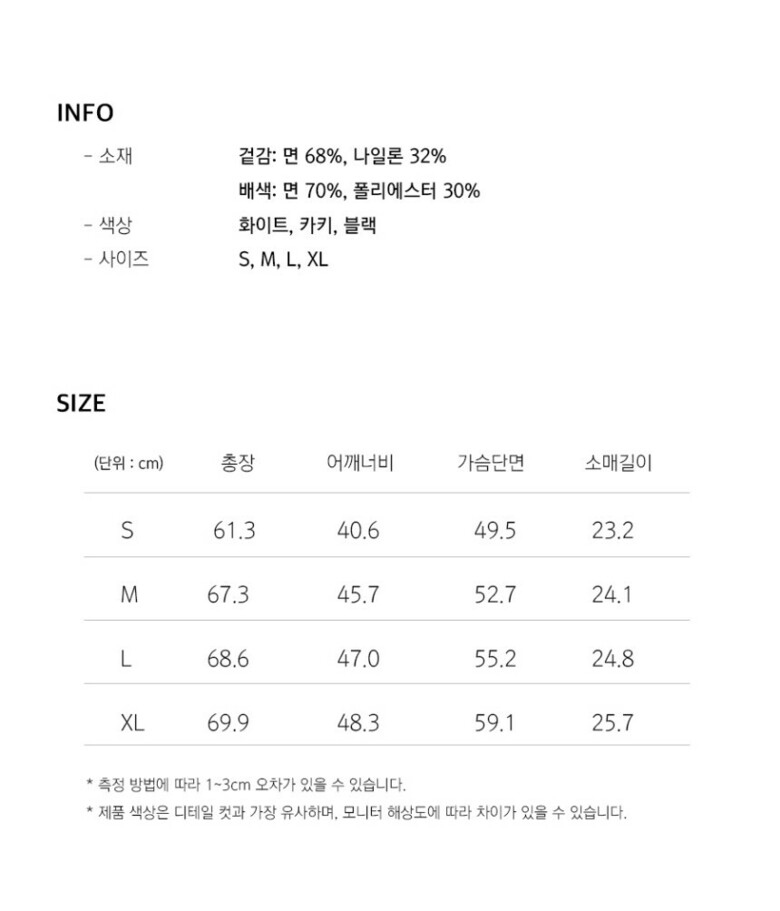 1. 제품 소재 (섬유의 조성 또는 혼용률을 백분율로 표시, 기능성인 경우 성적서 또는 허가서) 겉감:면 68%, 폴리에스테르 32% / 배색:면 70%, 폴리에스테르 30%