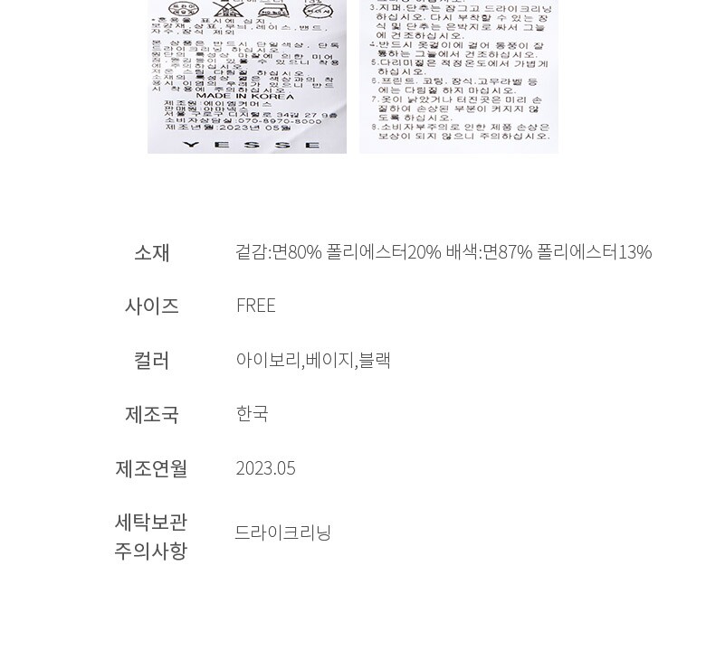 | 1. 제품 소재 (섬유의 조성 또는 혼용률을 백분율로 표시, 기능성인 경우 성적서 또는 허가서) | 상세페이지 참조 |