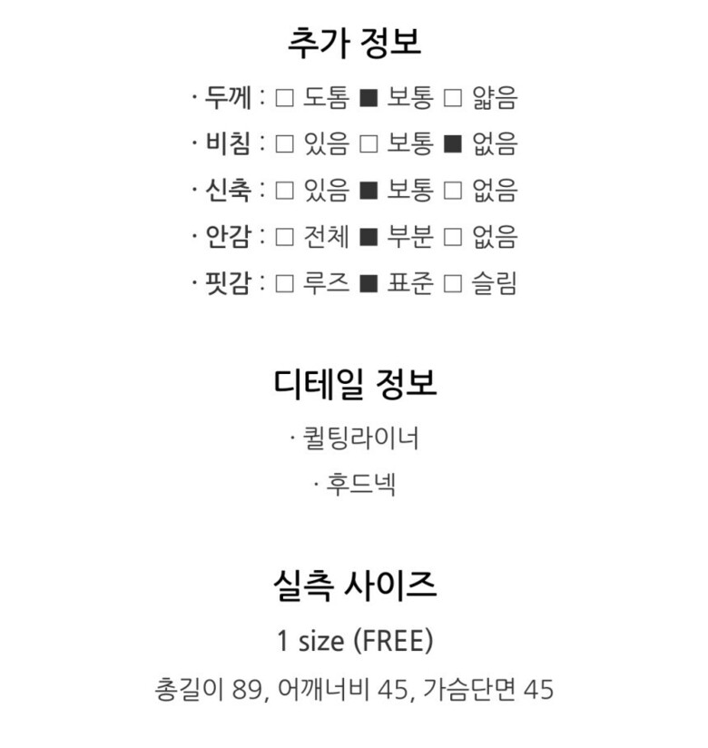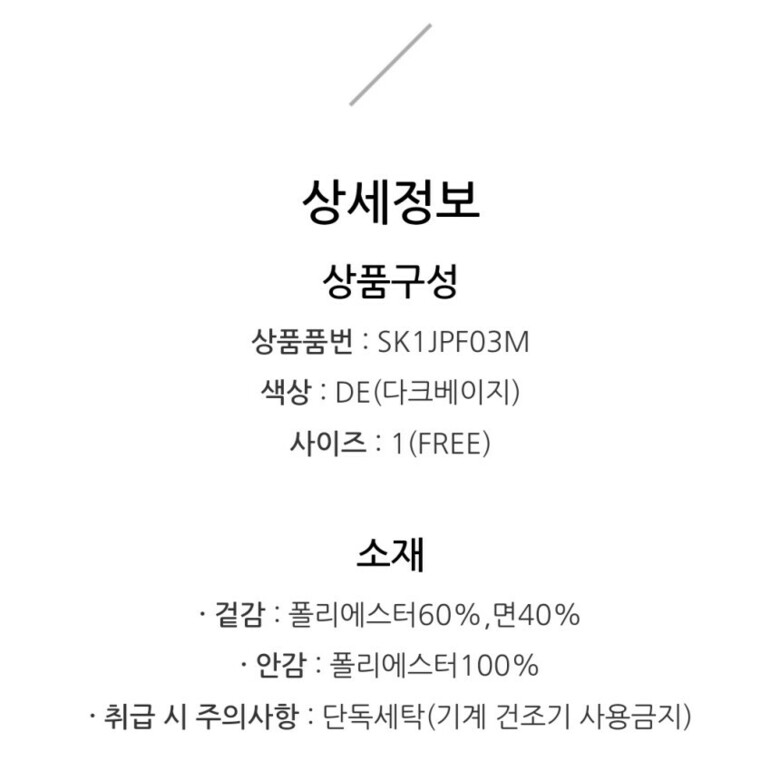 | 1. 제품 소재 (섬유의 조성 또는 혼용률을 백분율로 표시, 기능성인 경우 성적서 또는 허가서) | 상품상세참조 |
