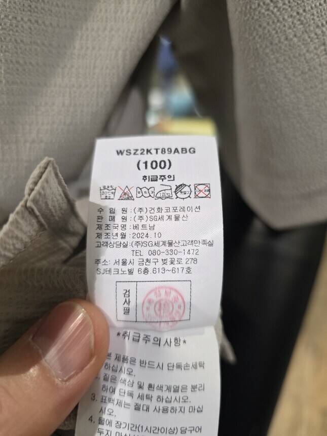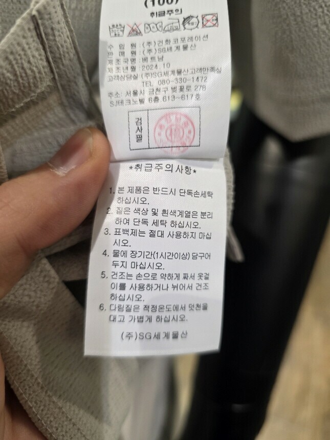 6. 세탁방법 및 취급시 주의사항 단독 손세탁