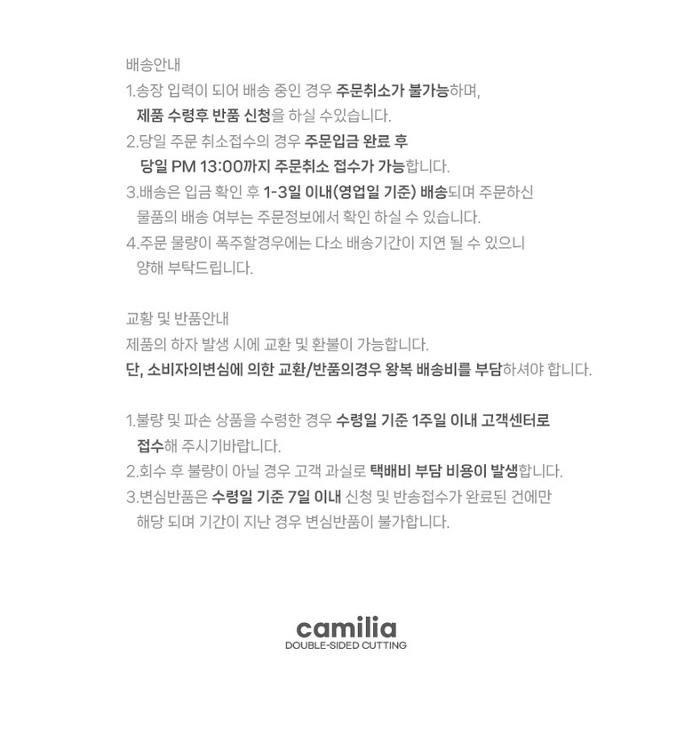 • 모든 규정은 전자상거래법에 의거하며, 택배사정으로 배송이 지연된 경우 재화를 공급받은 날로부터 7일 이내에 반품 가능합니다.