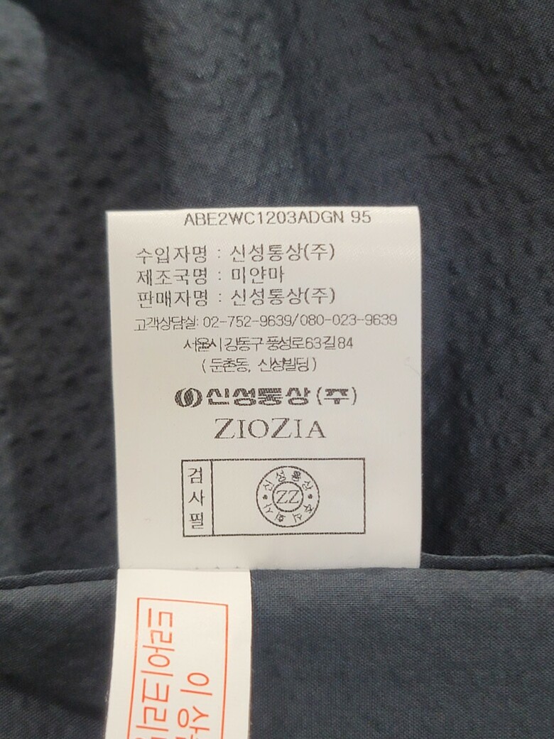 | 1. 제품 소재 (섬유의 조성 또는 혼용률을 백분율로 표시, 기능성인 경우 성적서 또는 허가서) | 겉감:면 100% |