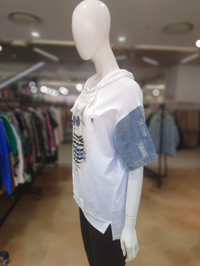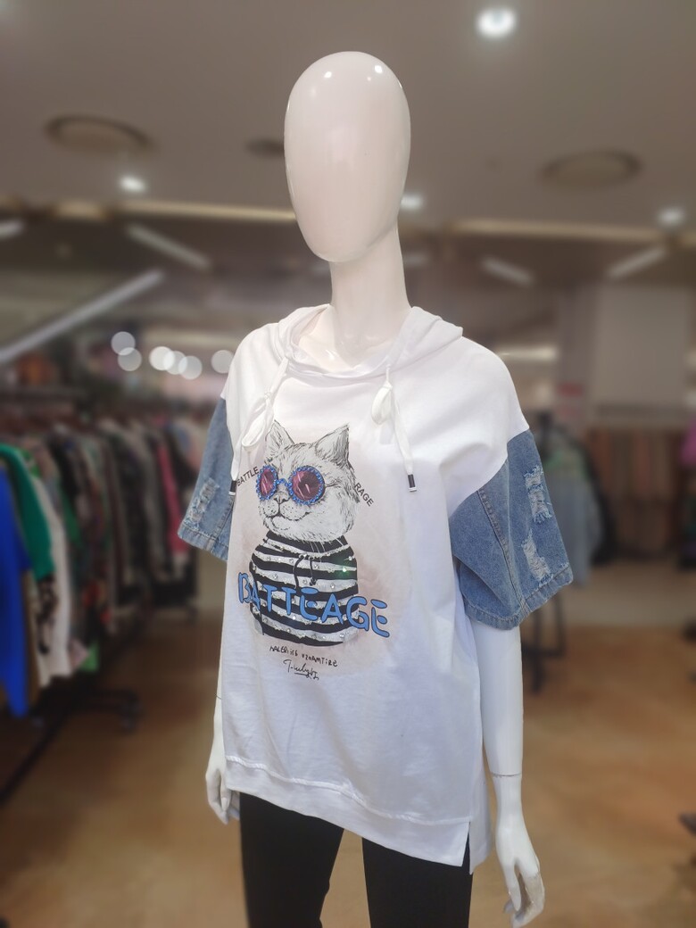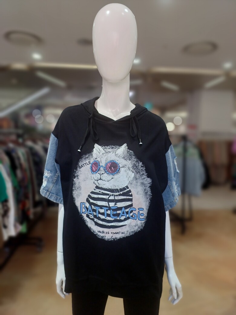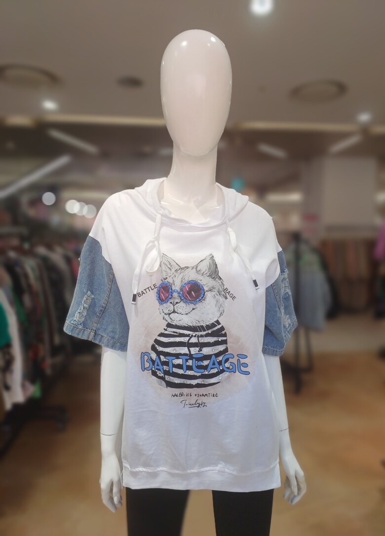 고양이 프린트와 데님 소매 배색이 포인트인