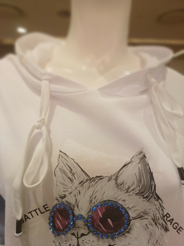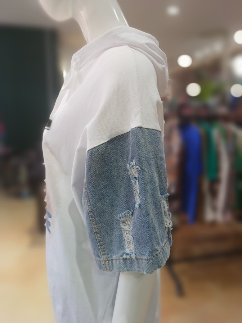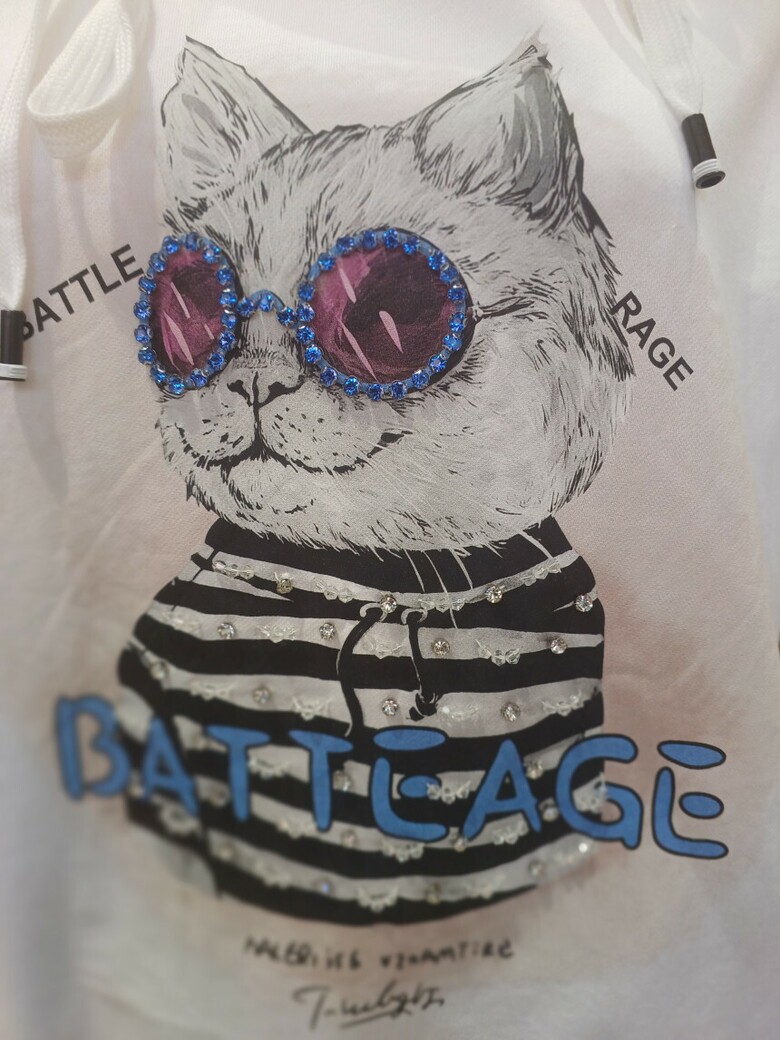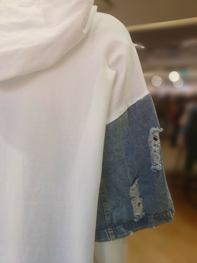 고양이 프린트와 데님 소매 배색이 포인트인