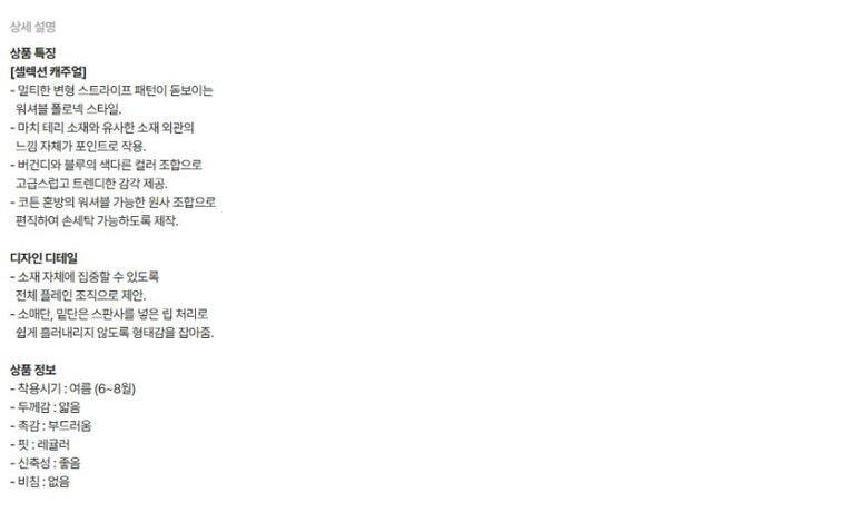 | 1. 제품 소재 (섬유의 조성 또는 혼용률을 백분율로 표시, 기능성인 경우 성적서 또는 허가서) | 상품상세참조 |