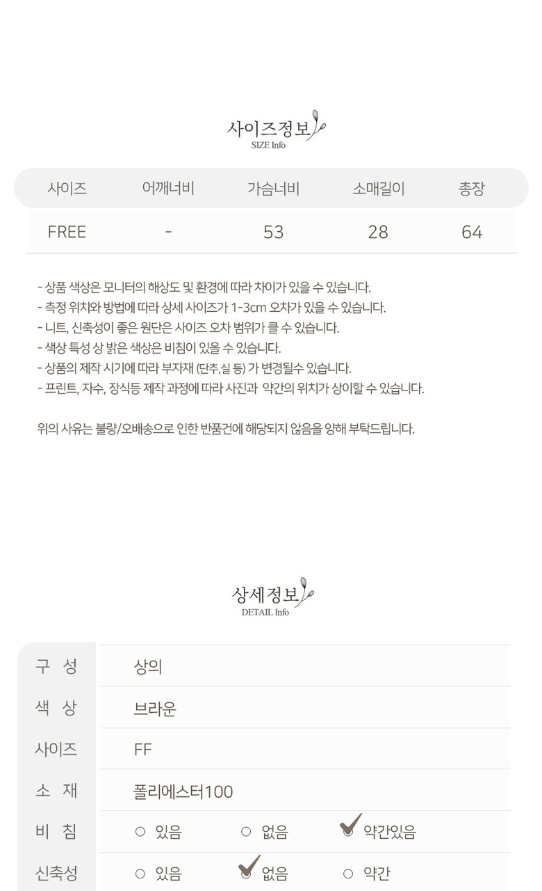 1. 제품 소재 (섬유의 조성 또는 혼용률을 백분율로 표시, 기능성인 경우 성적서 또는 허가서) | 상세페이지 참조 |
