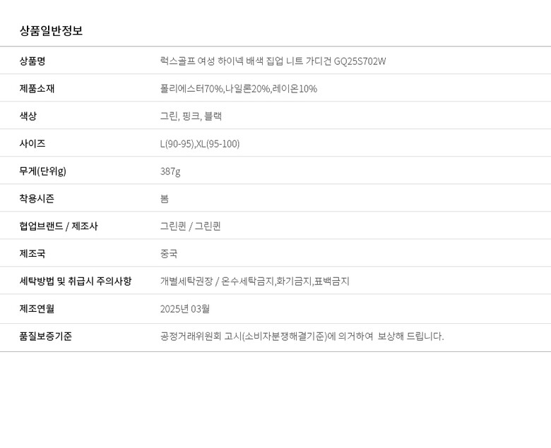 1. 제품 소재 (섬유의 조성 또는 혼용률을 백분율로 표시, 기능성인 경우 성적서 또는 허가서) | 폴리에스터70%,나일론20%,레이온10% |
