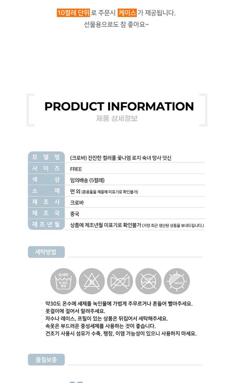 • 모든 규정은 전자상거래법에 의거하며, 택배사정으로 배송이 지연된 경우 재화를 공급받은 날로부터 7일 이내에 반품 가능합니다.