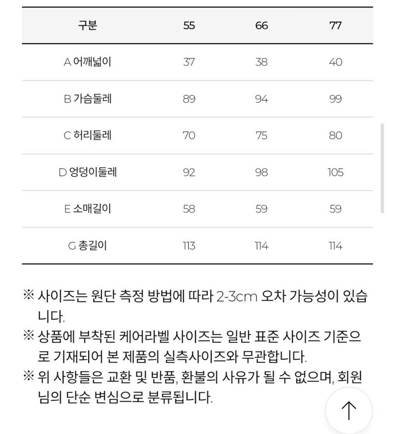 • 처음 배송된 상품상태와 다를 경우(세탁/착용 후 외출하신 경우) 반품이 불가합니다.