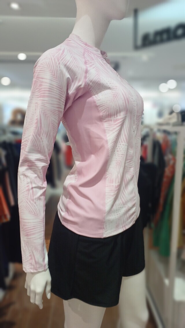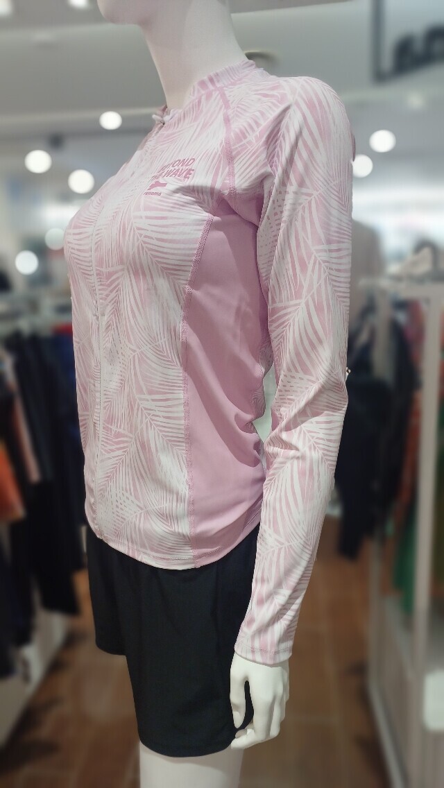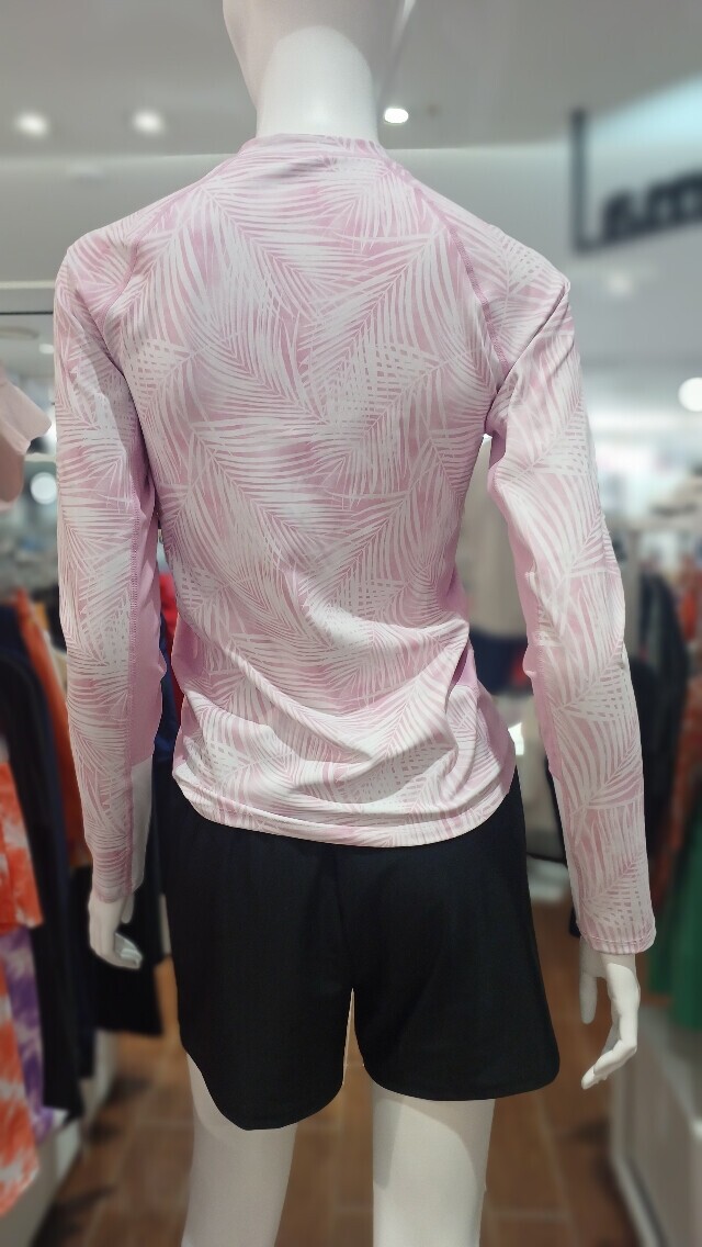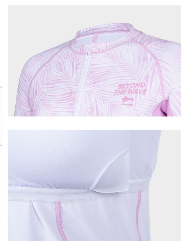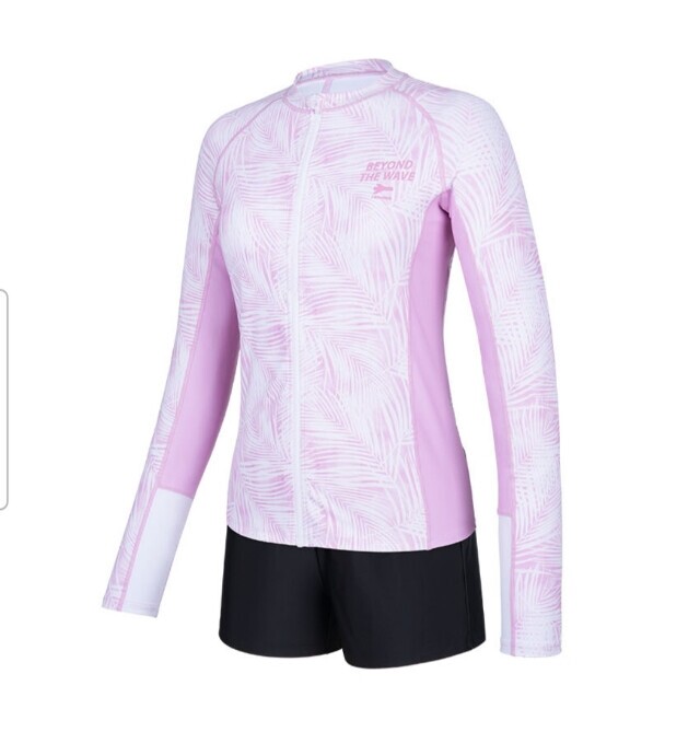 화사한 컬러의 야자수 프린트가 돋 보이며 사이드 배색 포인트로 슬림해 보이는 이너 내장형 래쉬가드세트입니다 .