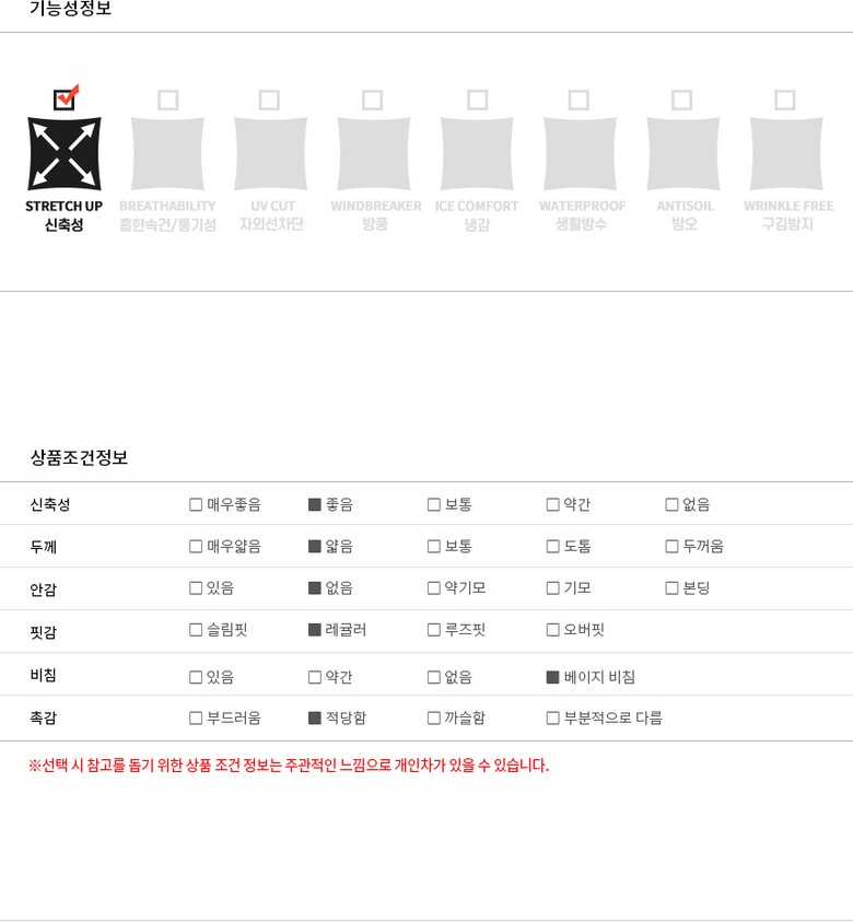 1. 제품 소재 (섬유의 조성 또는 혼용률을 백분율로 표시, 기능성인 경우 성적서 또는 허가서) 폴리에스터95%,폴리우레탄5%