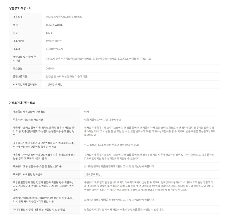 | 6. 세탁방법 및 취급시 주의사항 | 상품상세참조 |