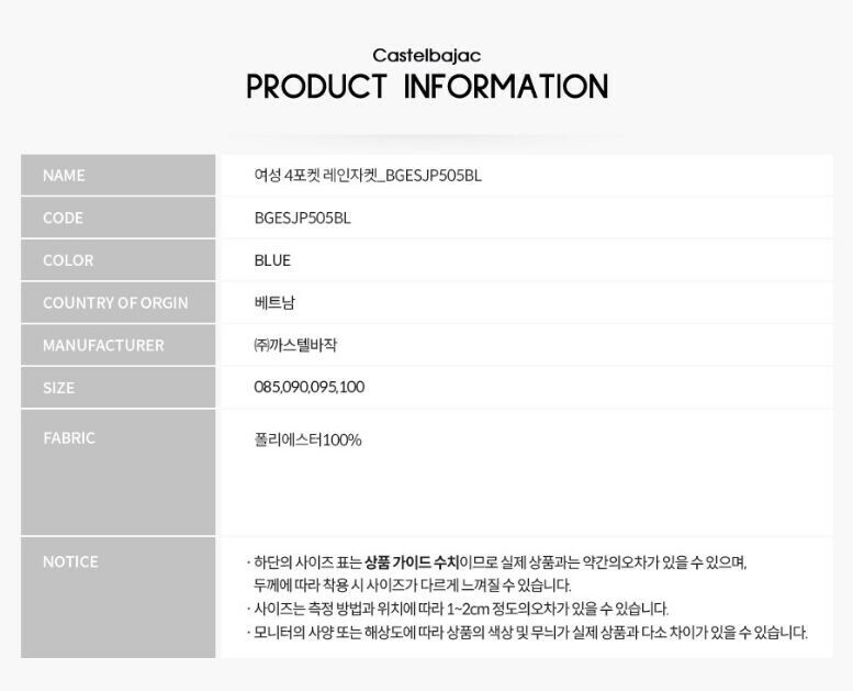 | 1. 품명 및 모델명 | 여성 중간 기장 레인쟈켓 |