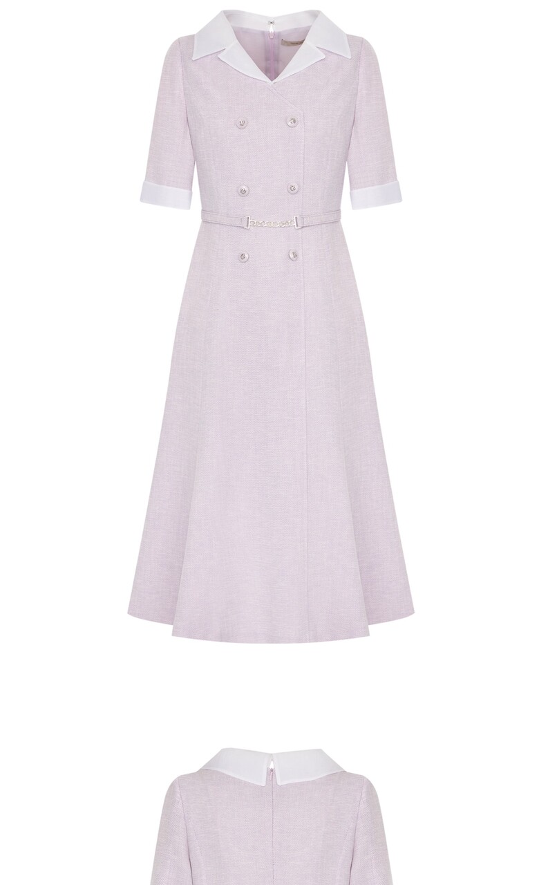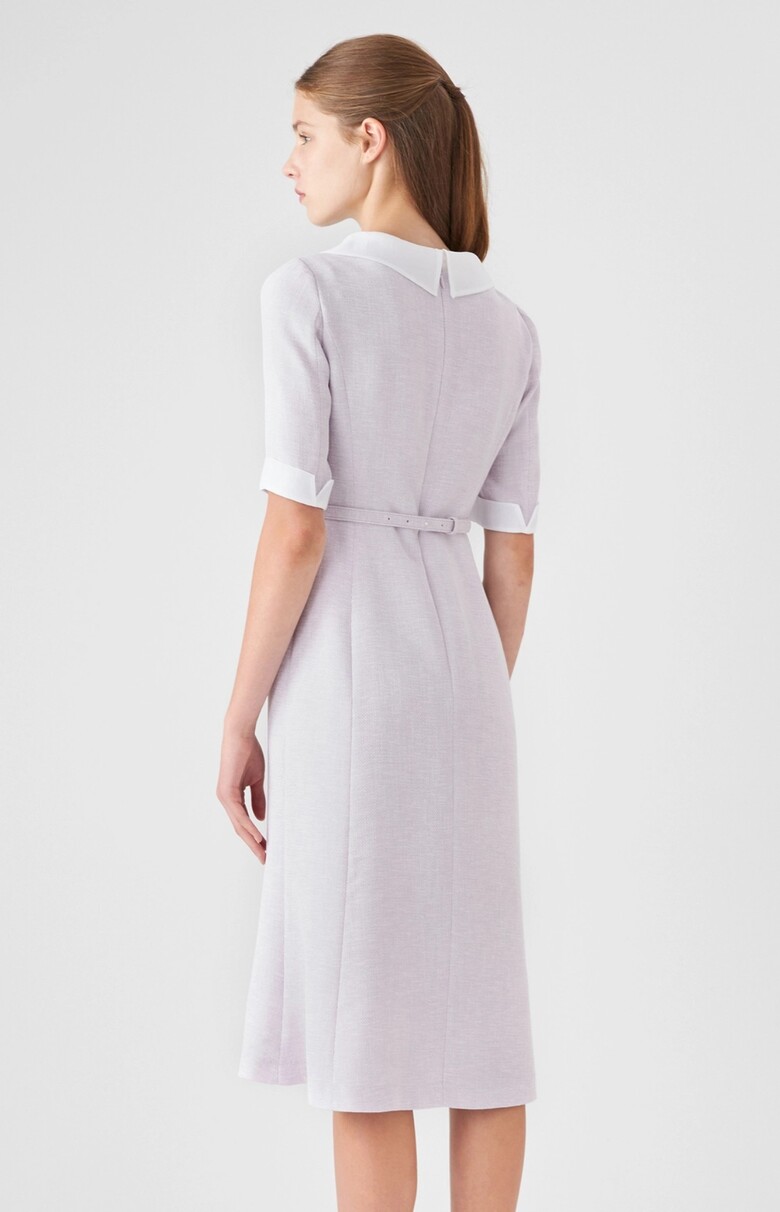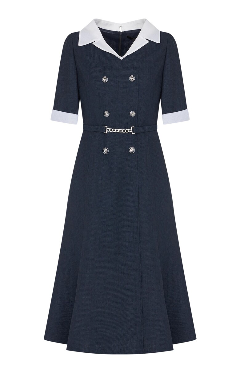 카라 배색 디자인이 돋보이는 미디 기장 원피스입니다.