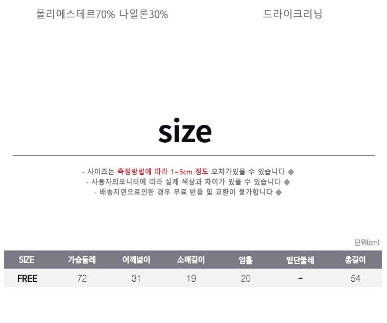 | 1. 제품 소재 (섬유의 조성 또는 혼용률을 백분율로 표시, 기능성인 경우 성적서 또는 허가서) | 상세페이지 참조 |