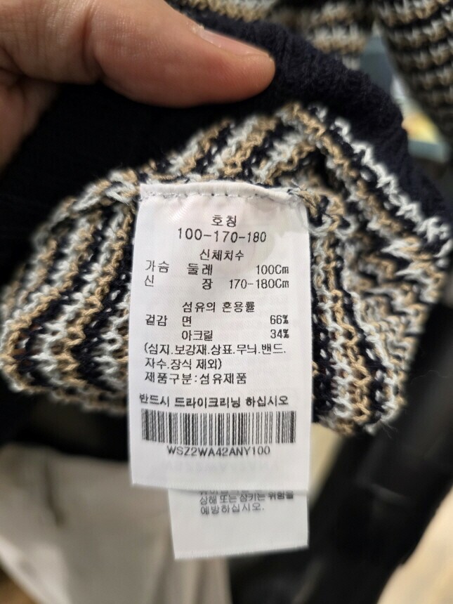 | 1. 제품 소재 (섬유의 조성 또는 혼용률을 백분율로 표시, 기능성인 경우 성적서 또는 허가서) | 겉감 : 면 66% , 아크릴 34% (심지,보강재,상표,무늬,밴드,자수,장식 |
