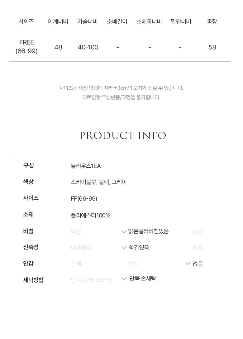 • 처음 배송된 상품상태와 다를 경우(세탁/착용 후 외출하신 경우) 반품이 불가합니다.