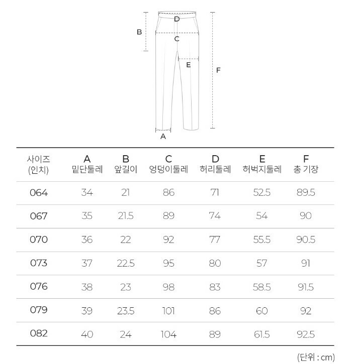 사이즈 : 64(24),67(25),70(26~27),73(28~29),76(30),79(31),82(32)