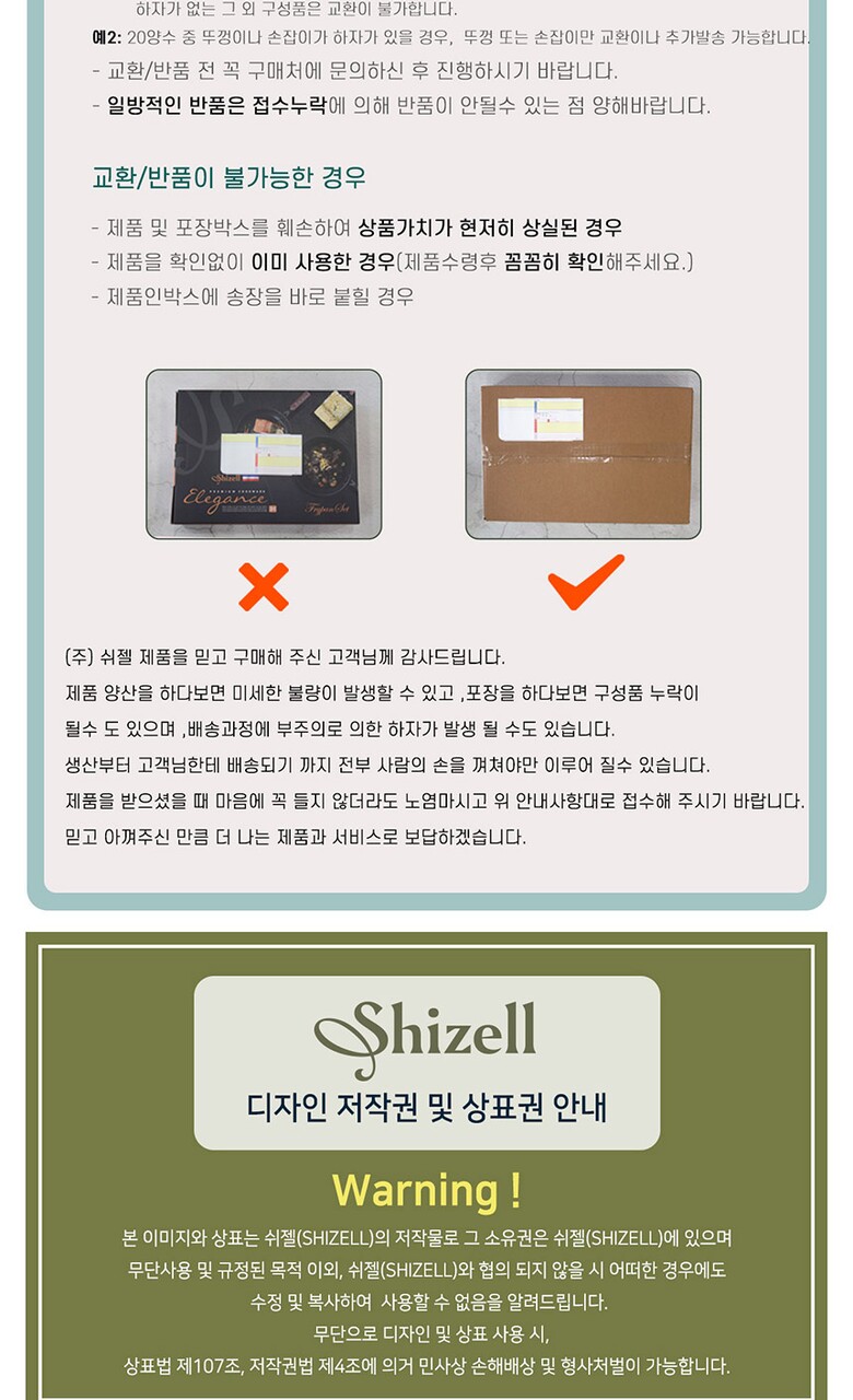 • 브랜드 박스로 포장된 상품은 해당 박스에 직접 테이핑, 송장을 부착한 경우 반품이 불가합니다.