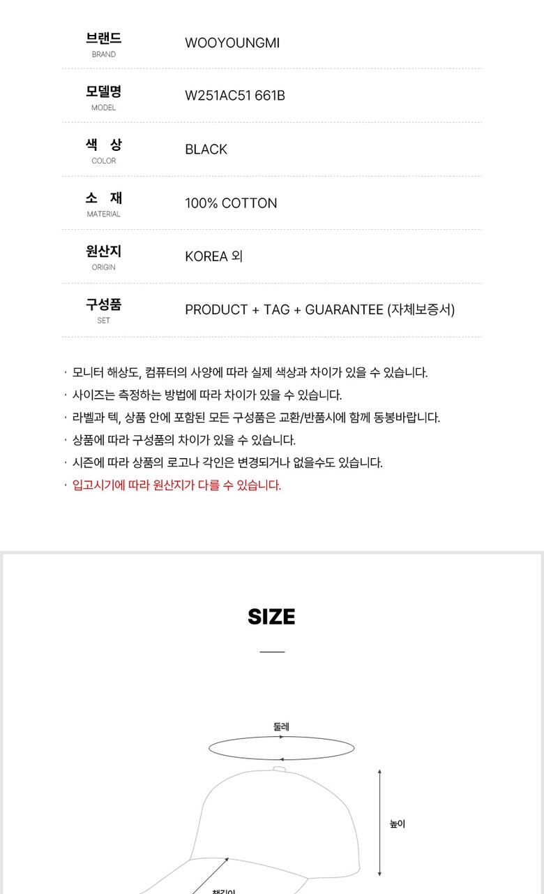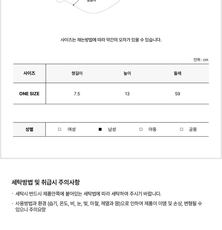 3. 치수 | 챙길이 7.5cm X 높이 13cm X 둘레 59cm |