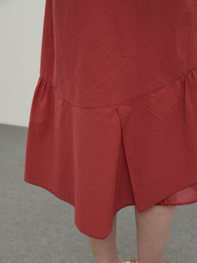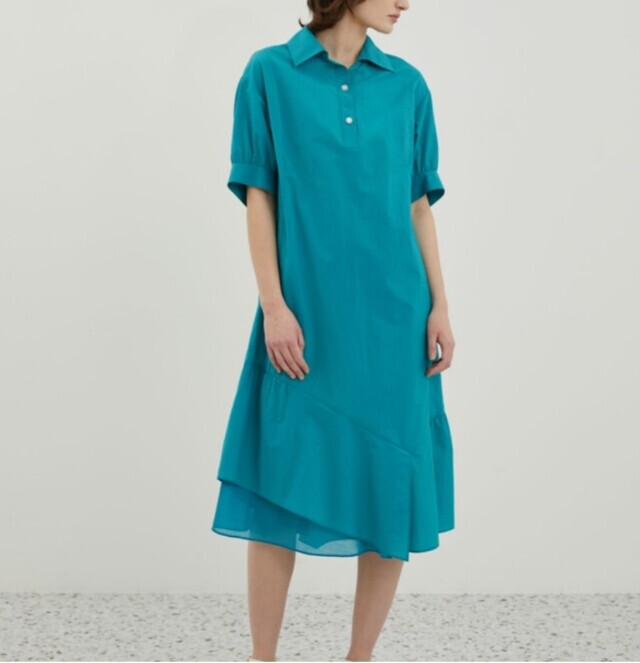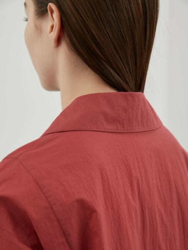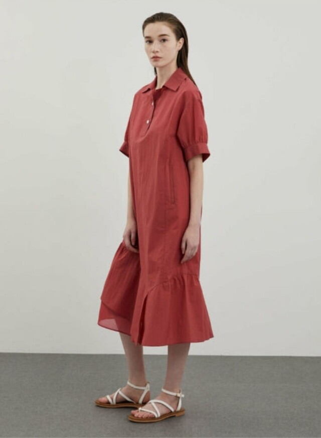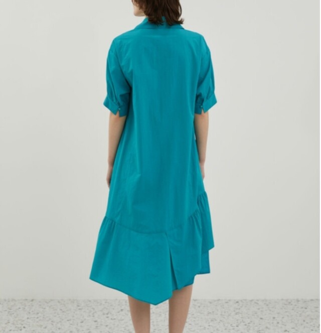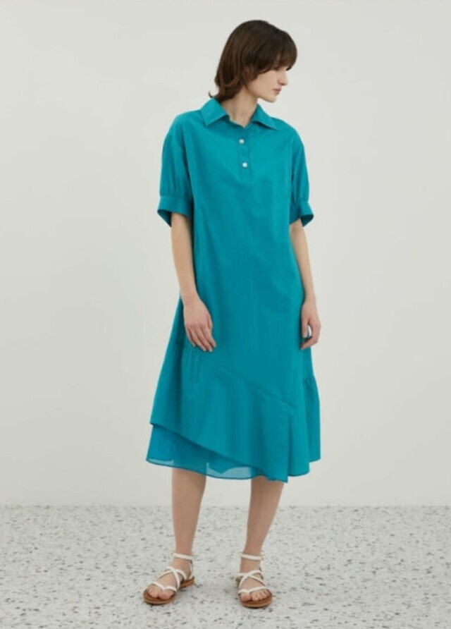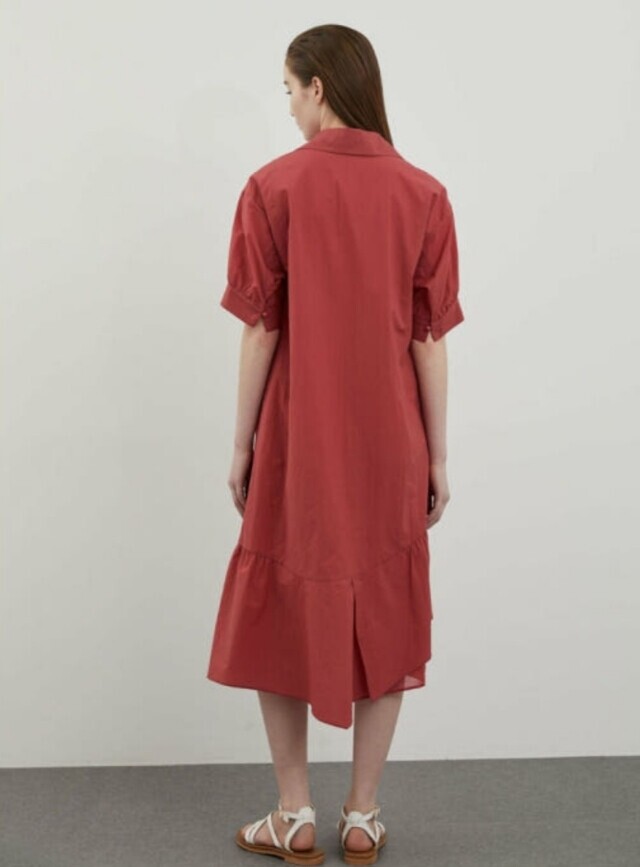 밑단과 소매에 셔링을 잡아 볼륨감 있는 실루엣을 연출하여 언밸런스하게 플레어지는 밑단이 특징이며