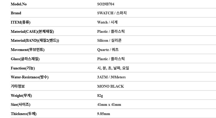 1. 소재 / 순도 / 밴드재질 블랙/ 케이스 - 플라스틱 / 밴드 - 실리콘