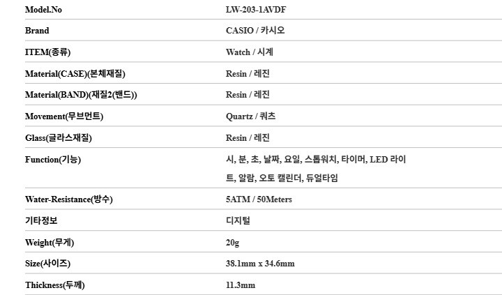 카시오 LW-203-1AVDF (LW-203-1A) 디지털 공용 우레탄시계