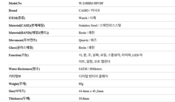 카시오 W-218HM-5BVDF (W-218HM-5B) 디지털 빈티지 클래식 공용 우레탄시계