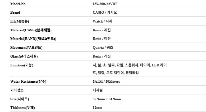| 7. 주요 사양 | 레진 시계 쿼츠 |