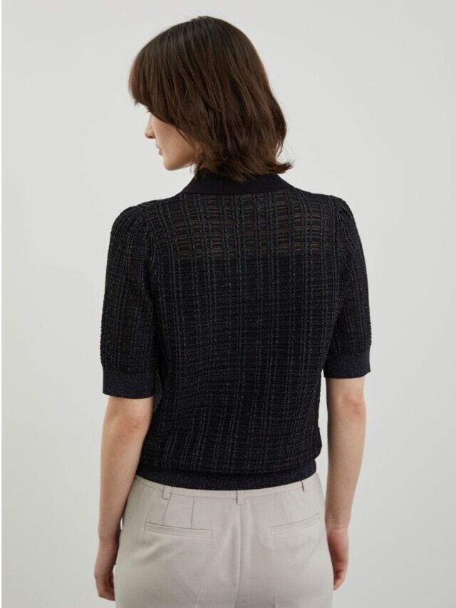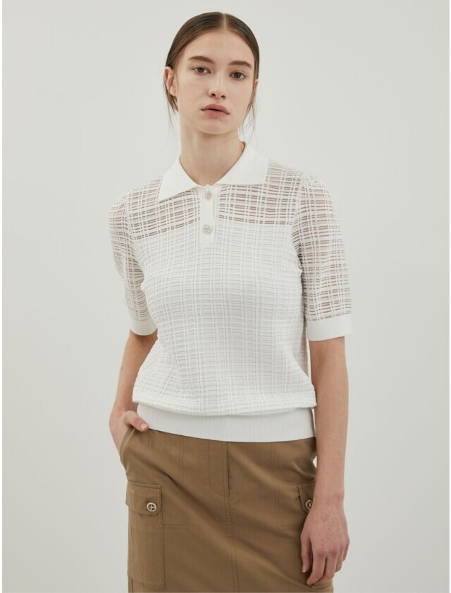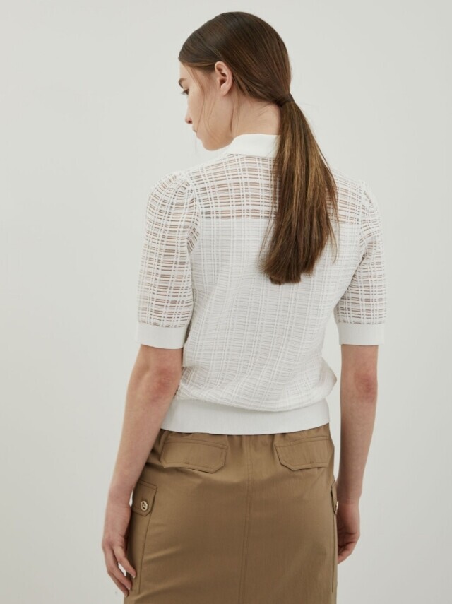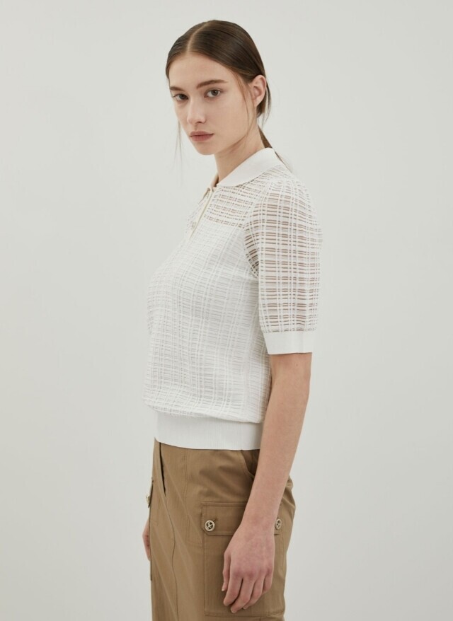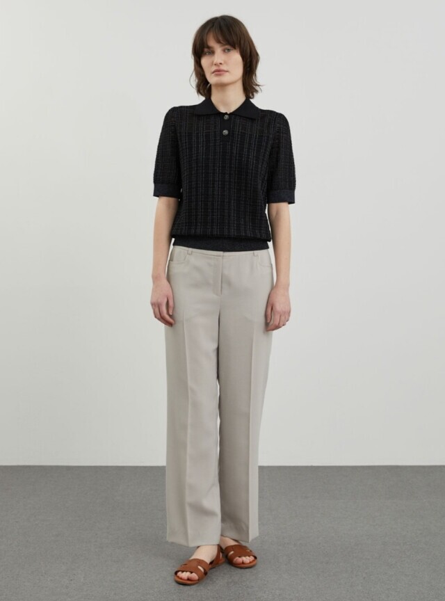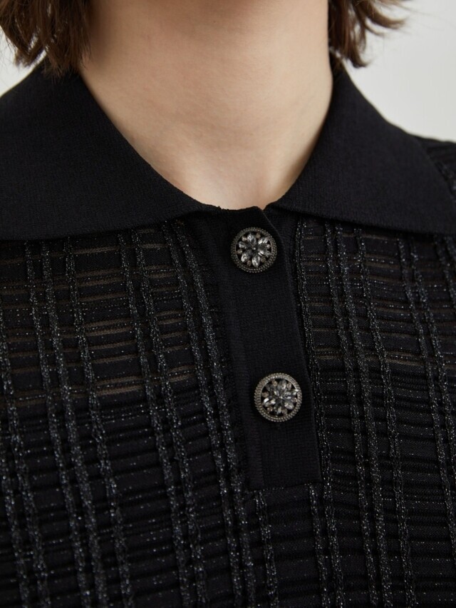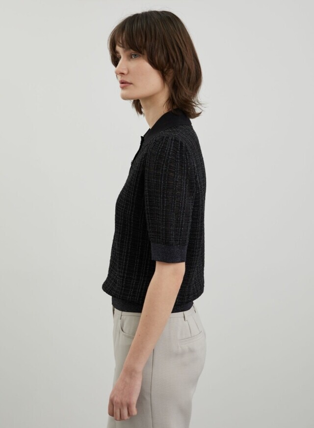 투명한 원사가 믹스된 카라형 니트 탑으로 앞단에