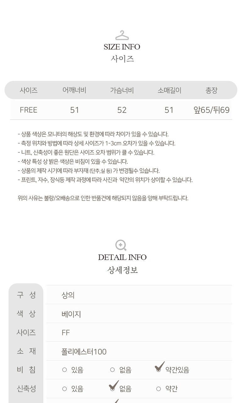 | 1. 제품 소재 (섬유의 조성 또는 혼용률을 백분율로 표시, 기능성인 경우 성적서 또는 허가서) | 상세페이지 참조 |