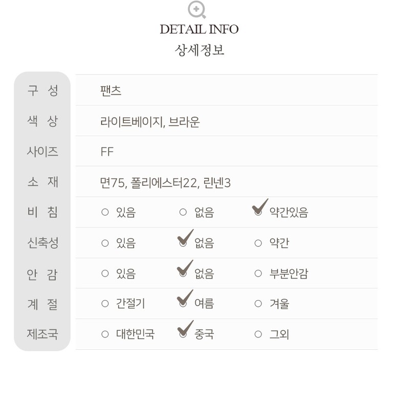 1. 제품 소재 (섬유의 조성 또는 혼용률을 백분율로 표시, 기능성인 경우 성적서 또는 허가서) 상세페이지 참조