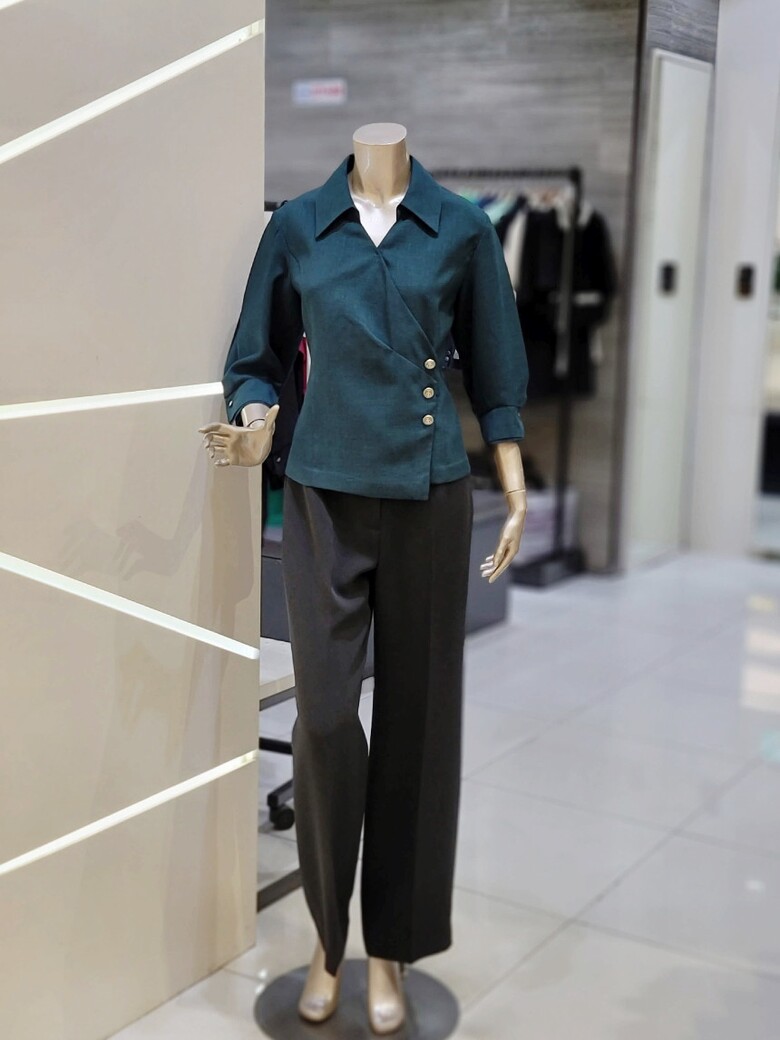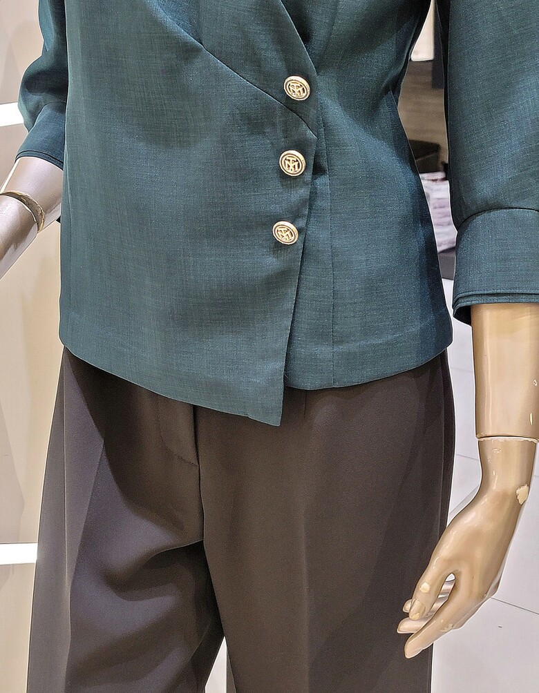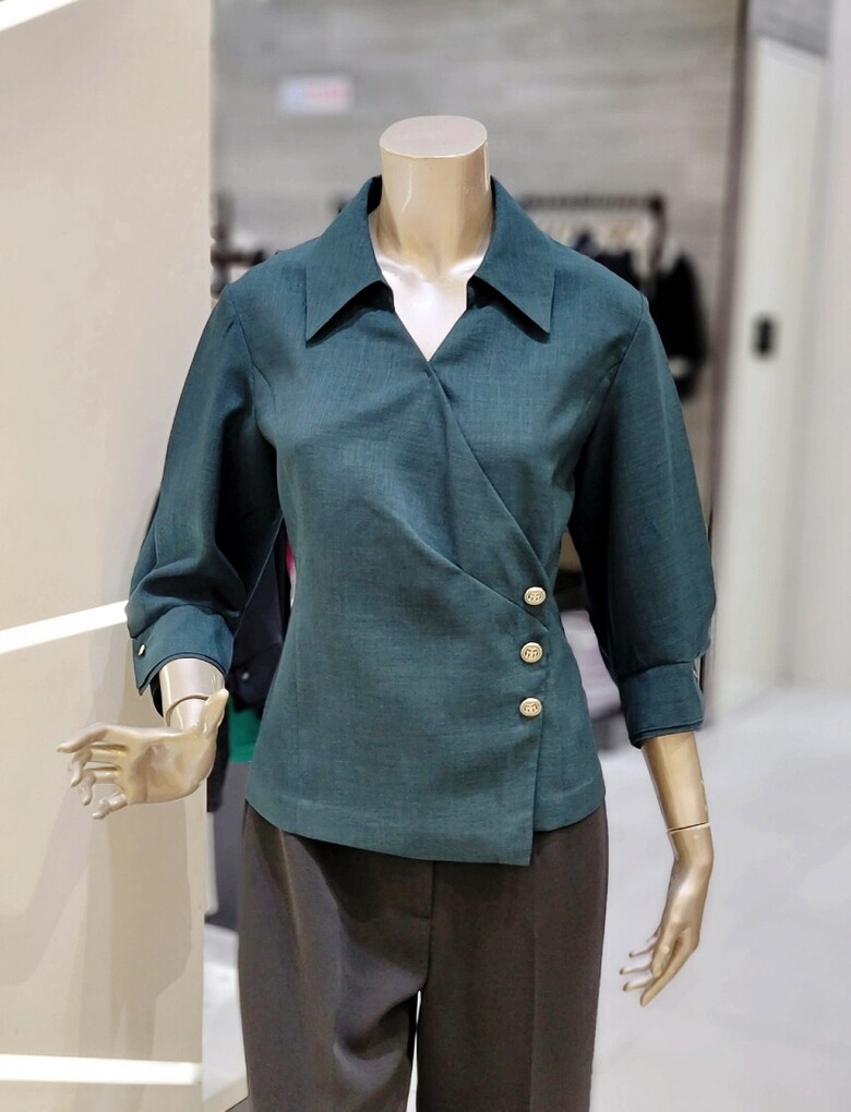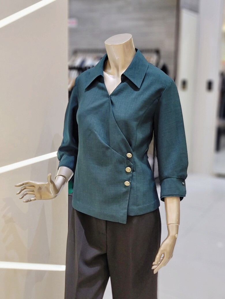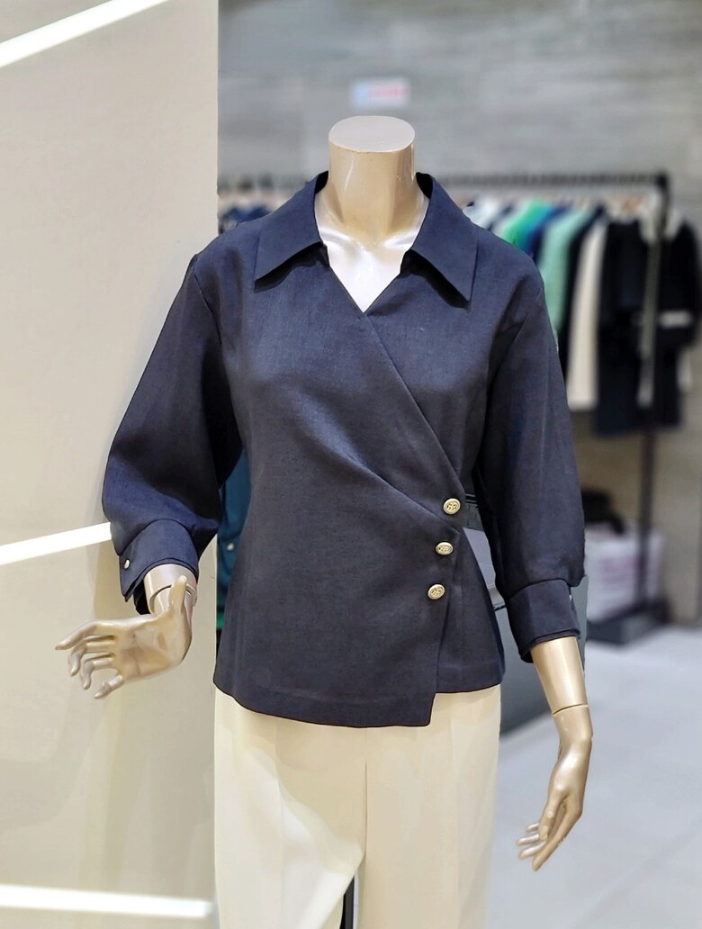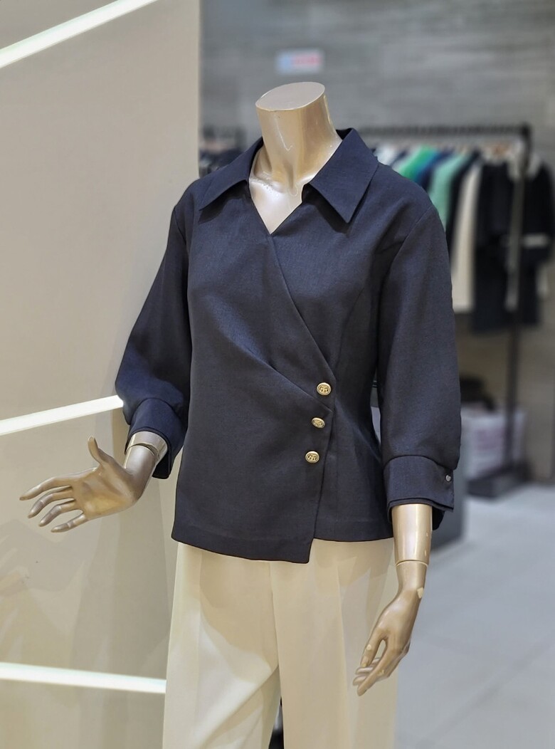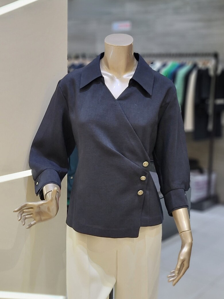 버튼 장식으로 포인트를 주는 블라우스입니다.