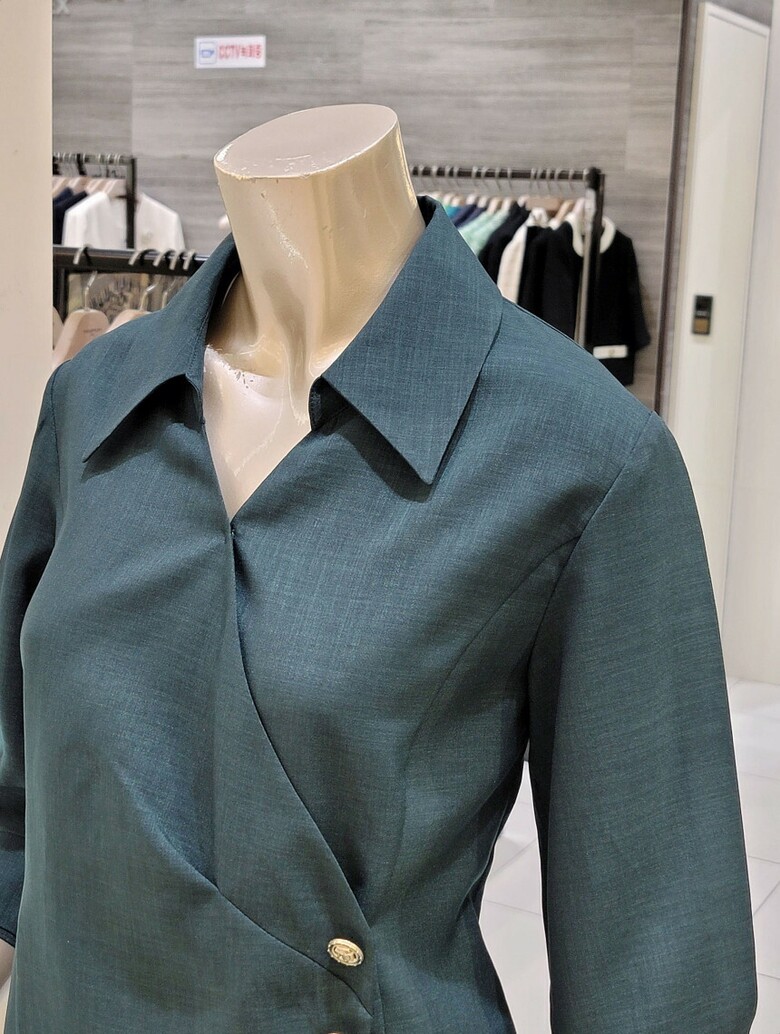 오픈칼라 넥 라인에 드레이프 턱 디테일에
