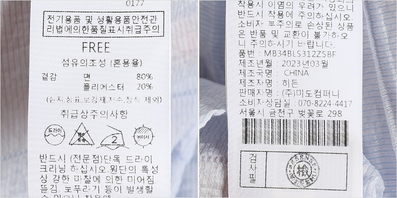 | 1. 제품 소재 (섬유의 조성 또는 혼용률을 백분율로 표시, 기능성인 경우 성적서 또는 허가서) | 겉감-면80% 폴리에스터20% |