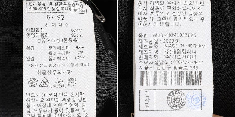 | 1. 제품 소재 (섬유의 조성 또는 혼용률을 백분율로 표시, 기능성인 경우 성적서 또는 허가서) | 겉감-폴리에스터98% 폴리우레탄2% |