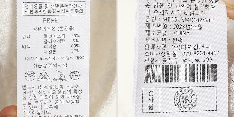 | 1. 제품 소재 (섬유의 조성 또는 혼용률을 백분율로 표시, 기능성인 경우 성적서 또는 허가서) | 겉감-폴리에스터95% 폴리우레탄5% 배색-레이온63%나일론37% |