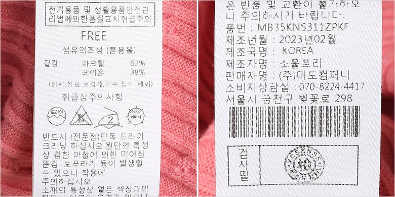1. 제품 소재 (섬유의 조성 또는 혼용률을 백분율로 표시, 기능성인 경우 성적서 또는 허가서) 겉감-레이온38% 아크릴62%