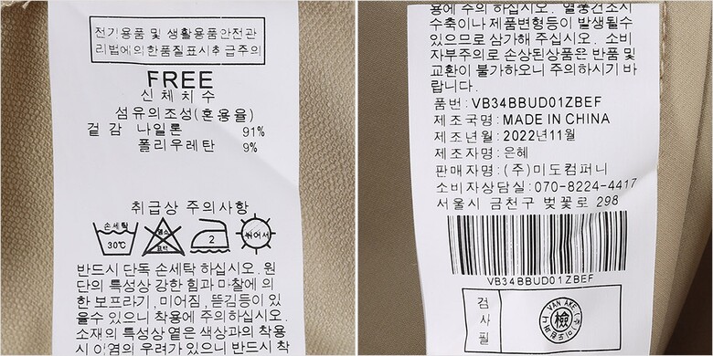 | 6. 세탁방법 및 취급시 주의사항 | 상세페이지 참조 |